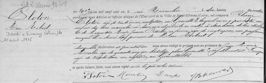 Robert PLOTON est né à Saint-Étienne le 6 novembre 1901 rue du Théâtre, d'une famille qui s'installera quelques années plus tard dans cette même ville au 14 rue César BERTHOLON.