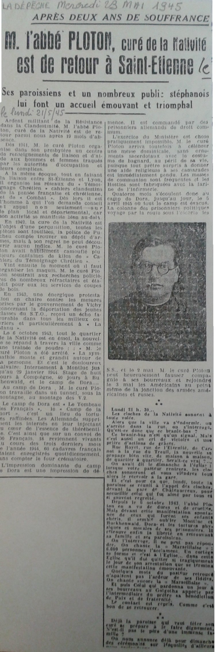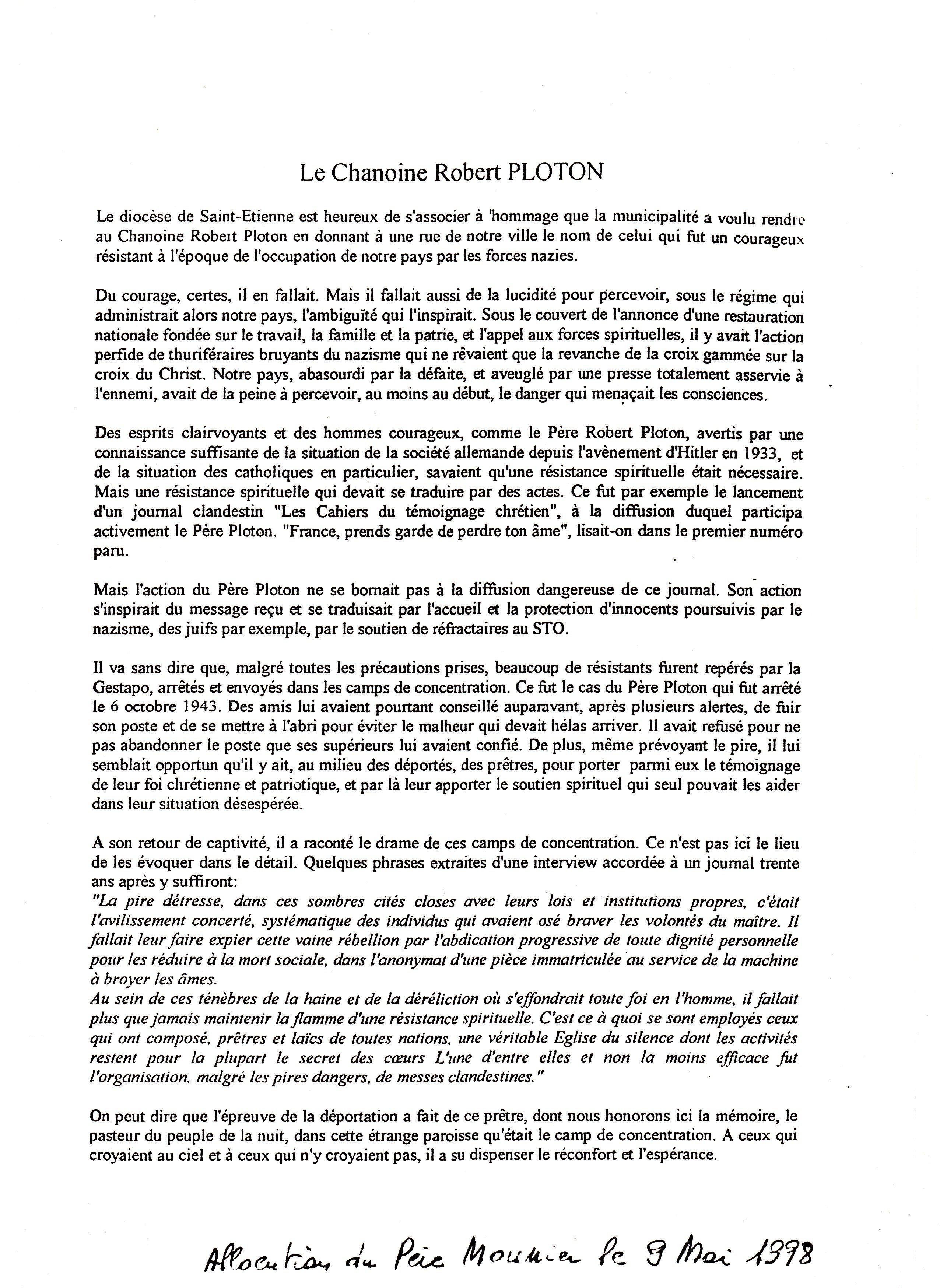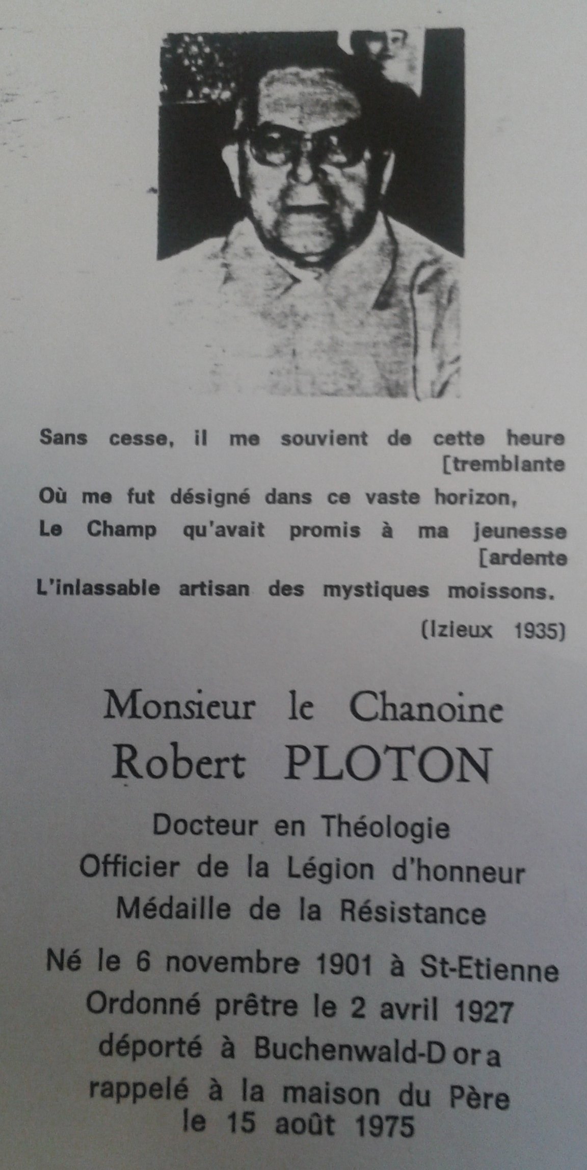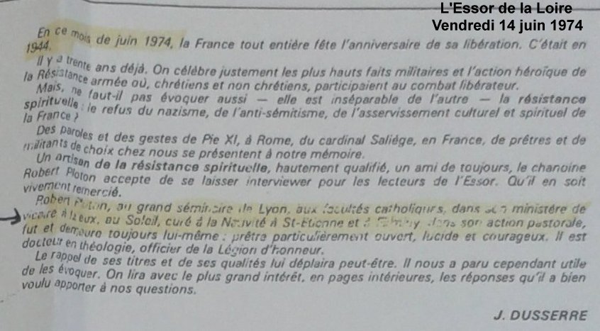 "Jusqu'en octobre 1943 toute l'organisation de la Résistance dans le sud repose sur les épaules de l'abbé Robert PLOTON à Saint-Étienne.