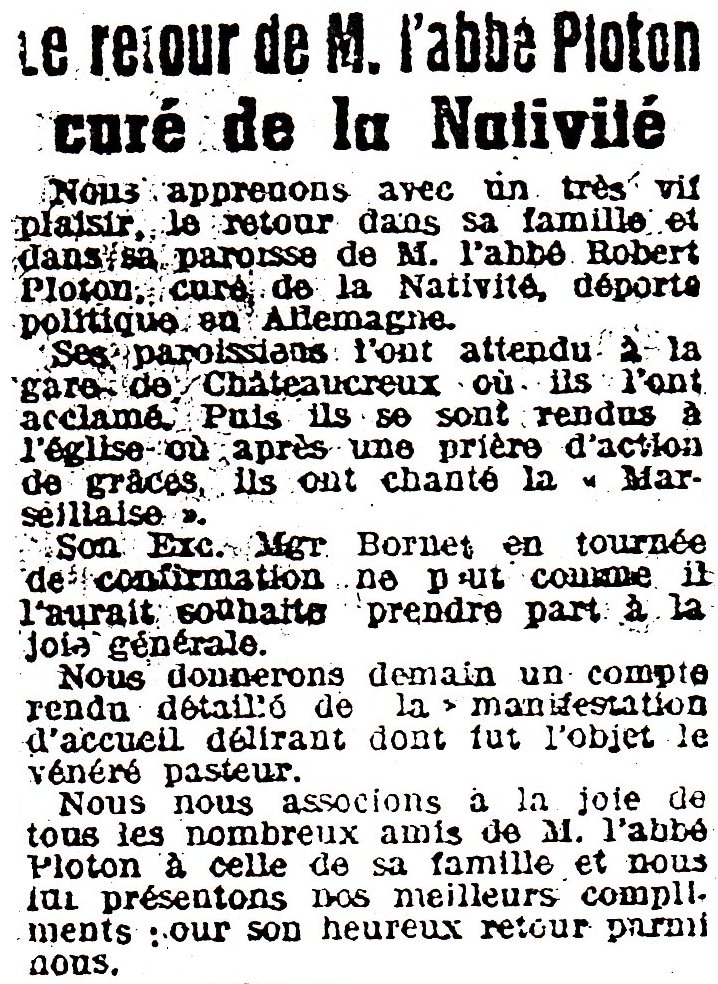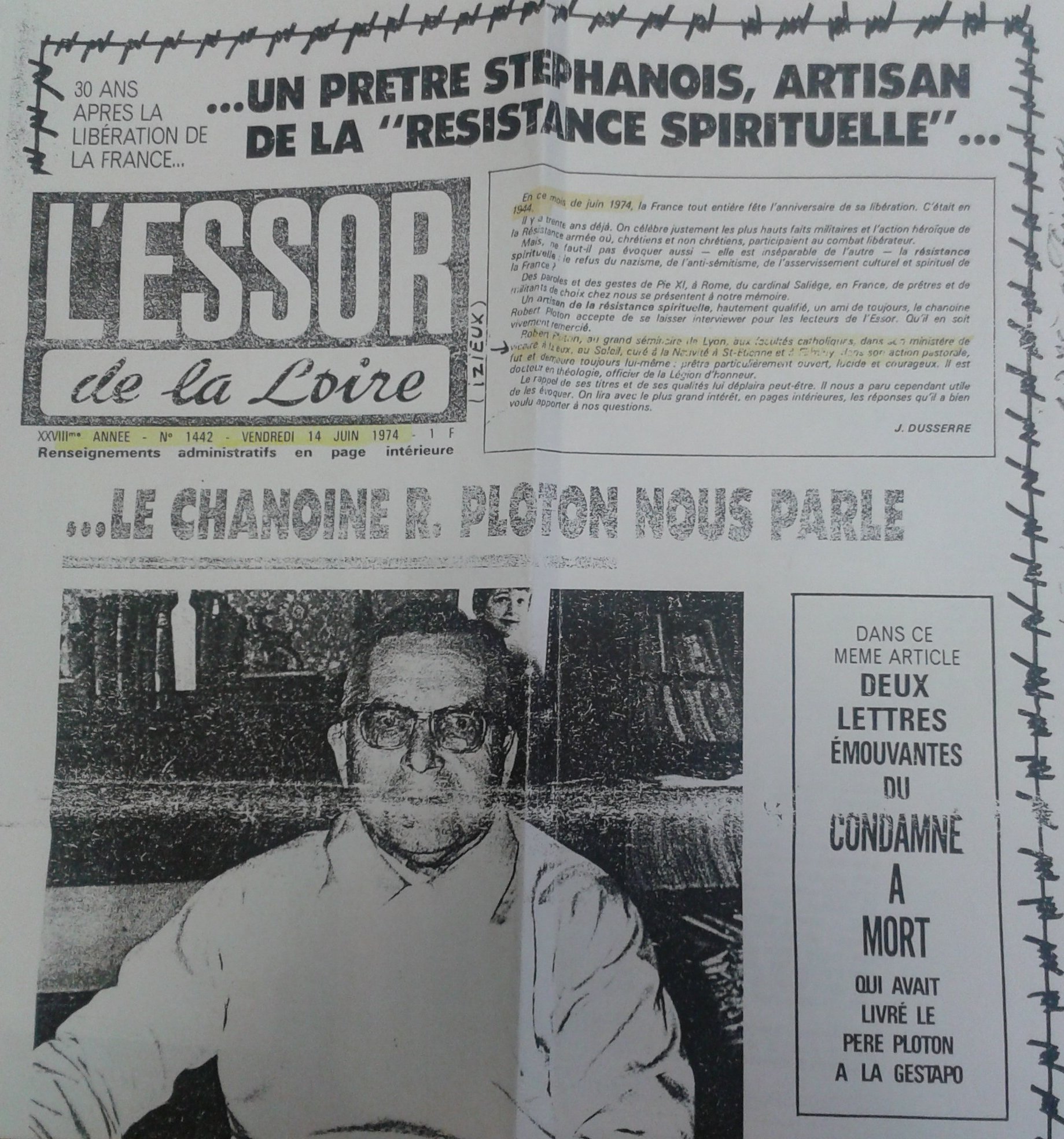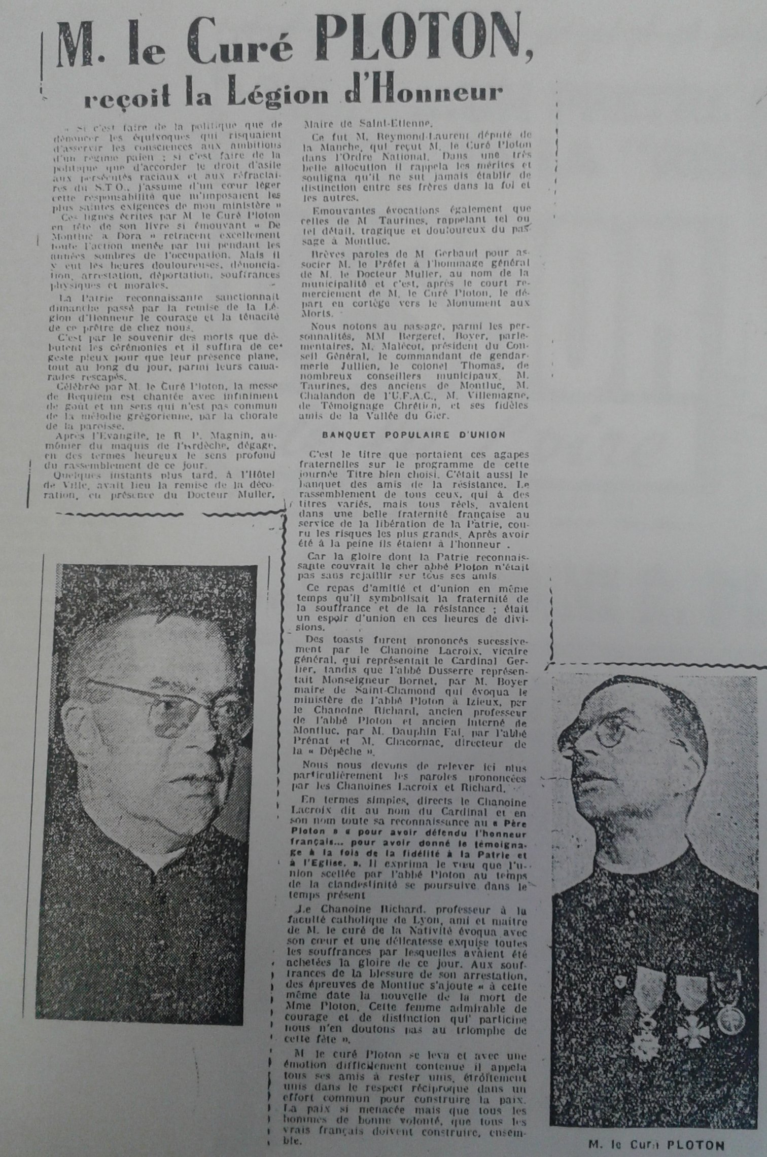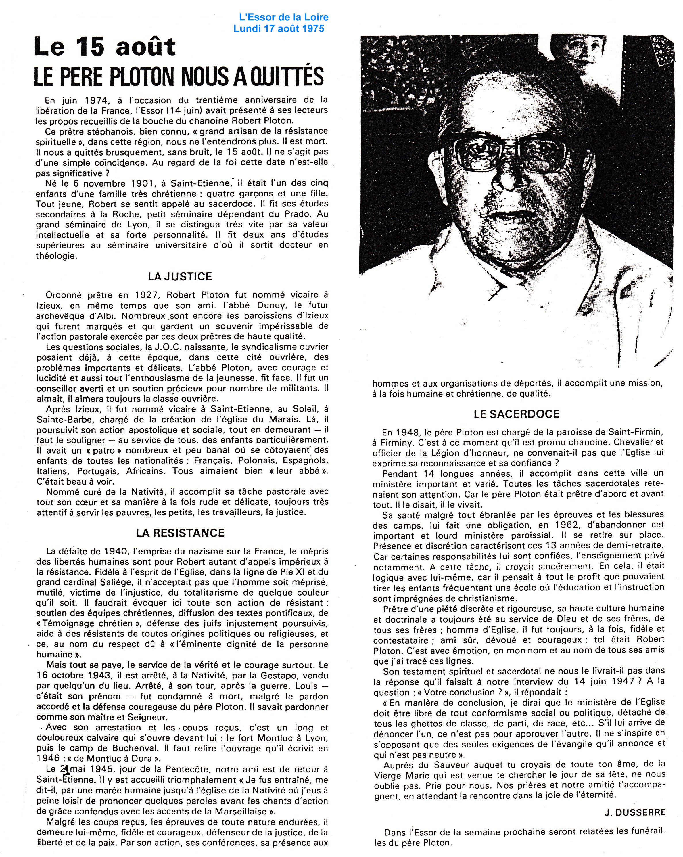 "Jusqu'en octobre 1943 toute l'organisation de la Résistance dans le sud repose sur les épaules de l'abbé Robert PLOTON à Saint-Étienne.