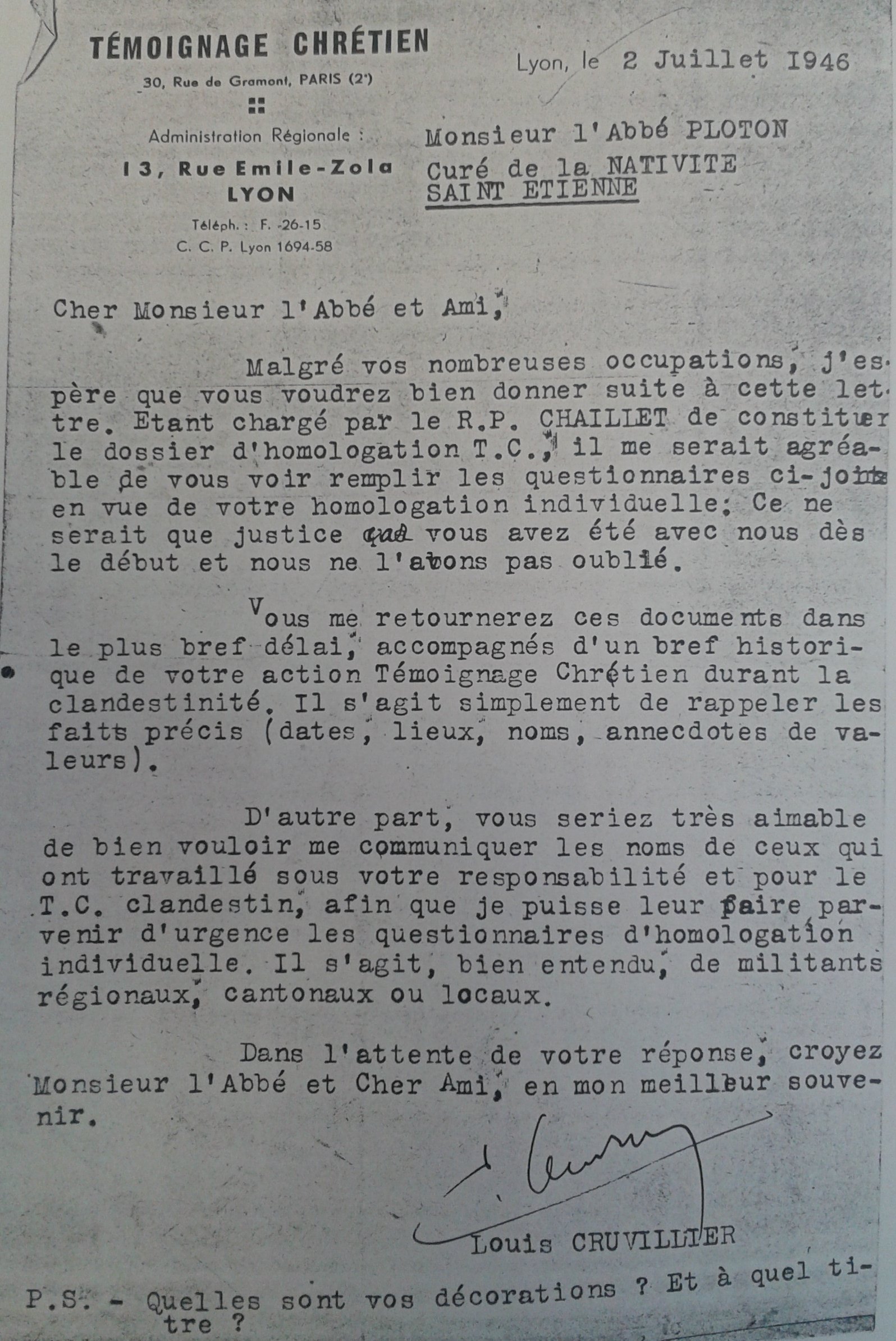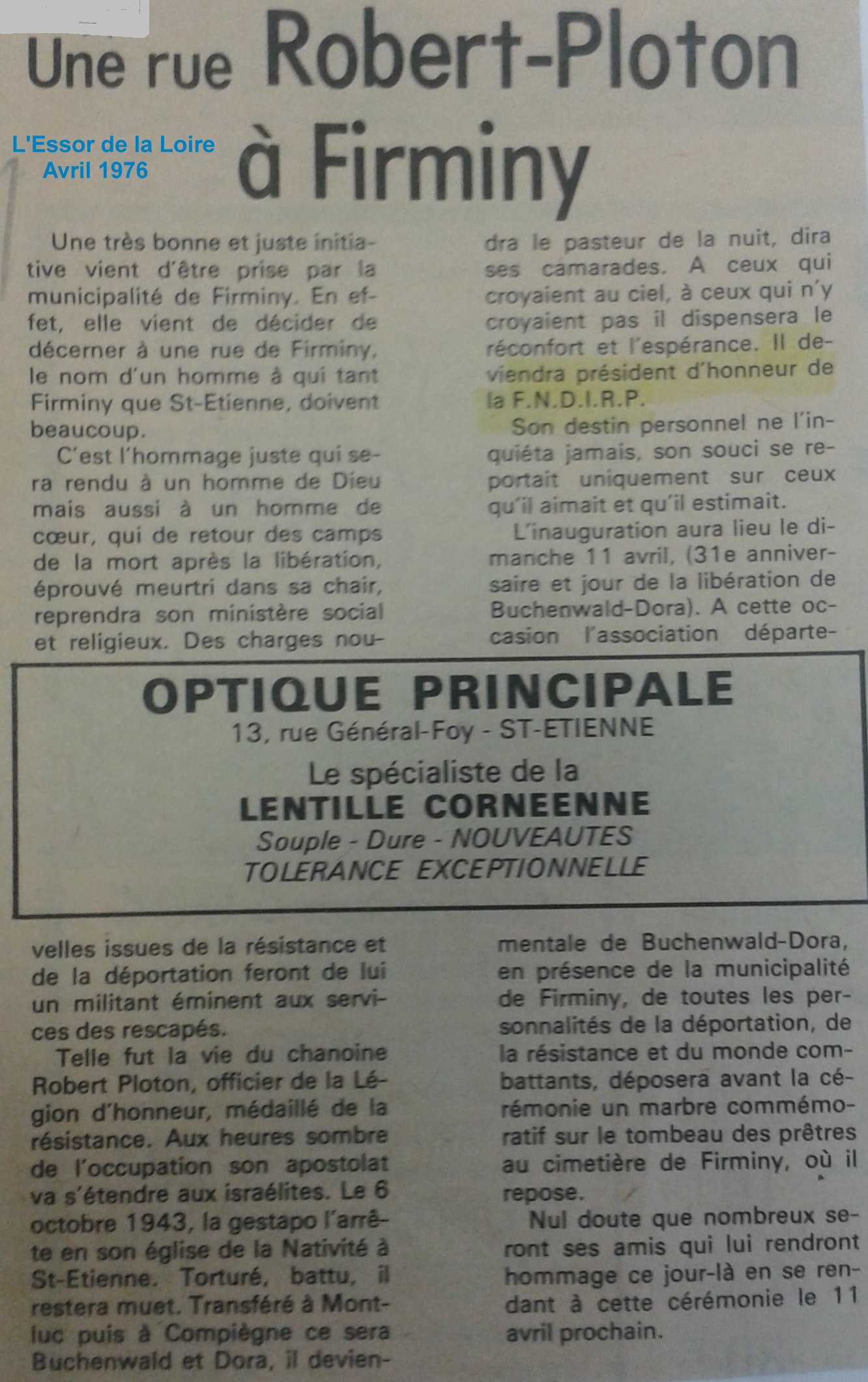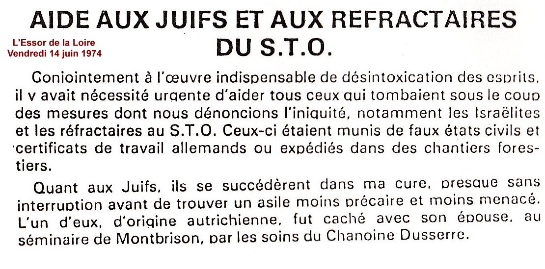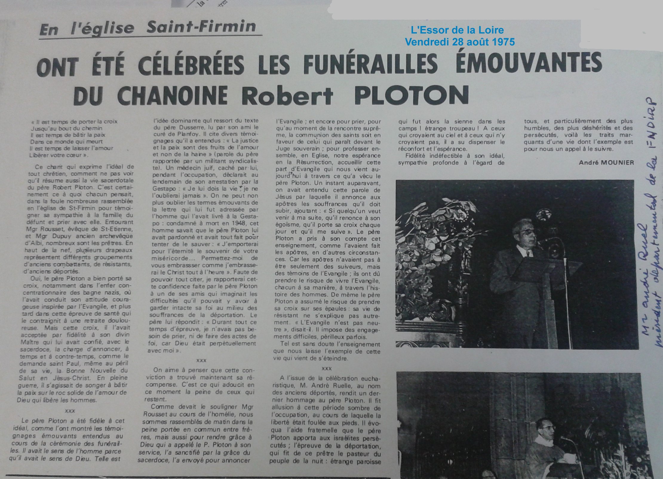 "Jusqu'en octobre 1943 toute l'organisation de la Résistance dans le sud repose sur les épaules de l'abbé Robert PLOTON à Saint-Étienne.
