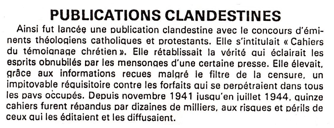 "Les Cahiers du Témoignage Chrétien" furent fondés par le père jésuite Pierre CHAILLET à Lyon. Le premier numéro sortit en novembre 1941. Rédigé par le père jésuite Gaston FESSARD il avait pour titre "France prends garde de perdre ton âme". Les deux premiers furent imprimés avec "Combat" par Joseph MARTINET dans le quartier du Tonkin (Villeurbanne).
