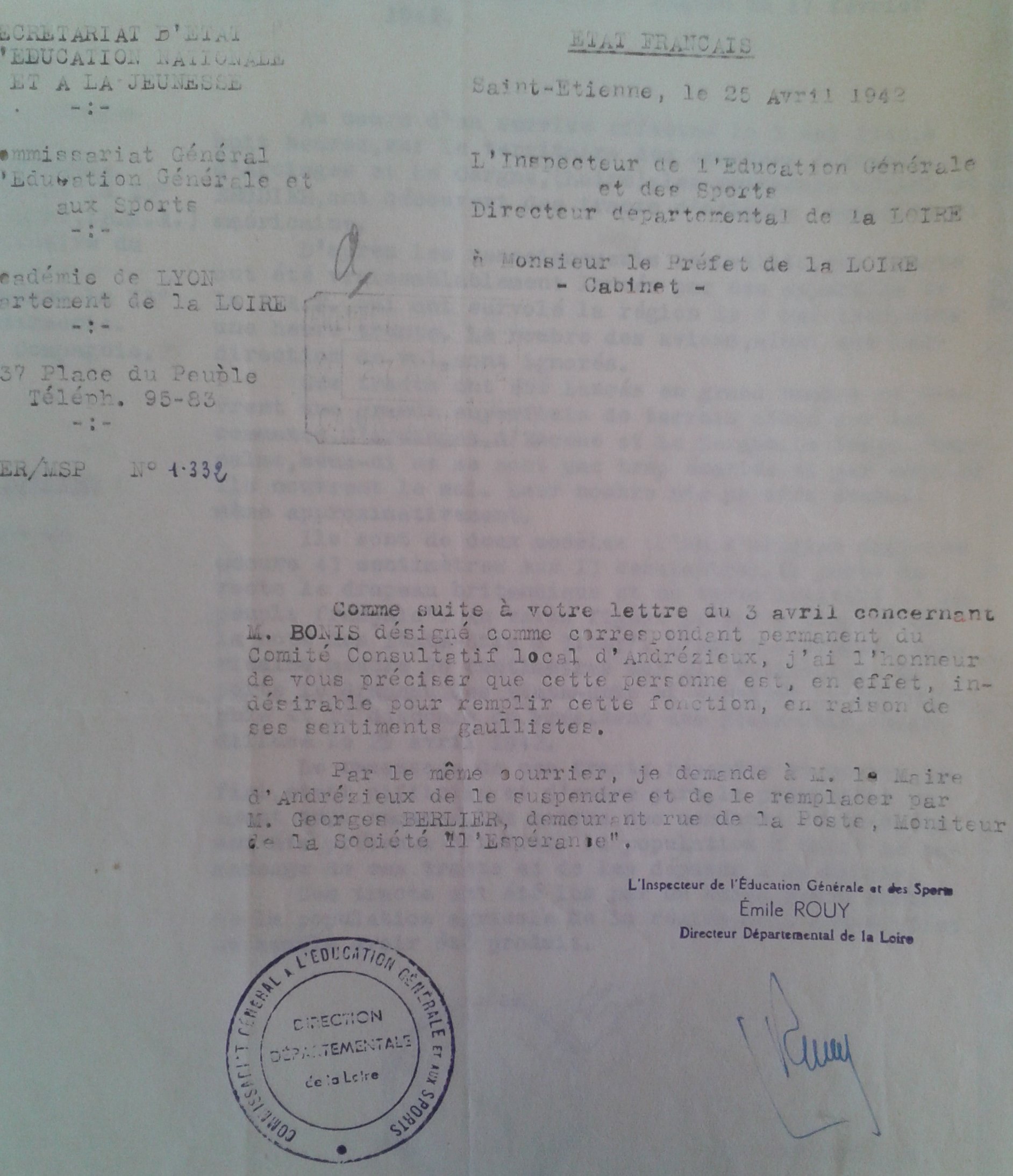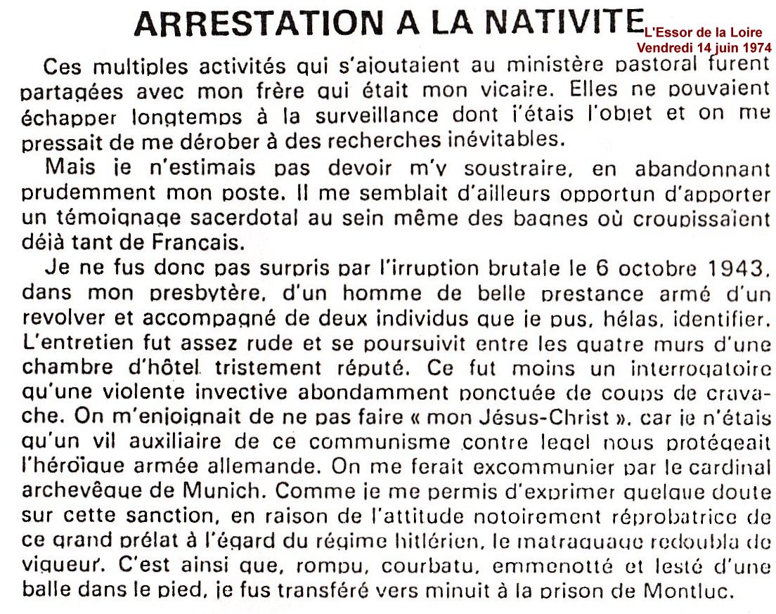 La presse stéphanoise par contre demeure silencieuse. Pareillement la municipalité pétainiste d'Amédée GUYOT ne bronche pas. Néanmoins Étienne BORNET, évêque auxiliaire de la ville, fait parvenir une lettre de protestation au chef de la police allemande de Lyon. Il y dénonce les conditions dans lesquelles son vicaire a été blessé, arrêté, roué de coups. Il souligne que la perquisition effectuée au presbytère fut une "véritable mise à sac d'une maison où tous les biens n'appartenaient pas à un seul occupant : pillage des tiroirs dont l'argent des pauvres a été enlevé (...) main basse sur le chocolat des enfants."