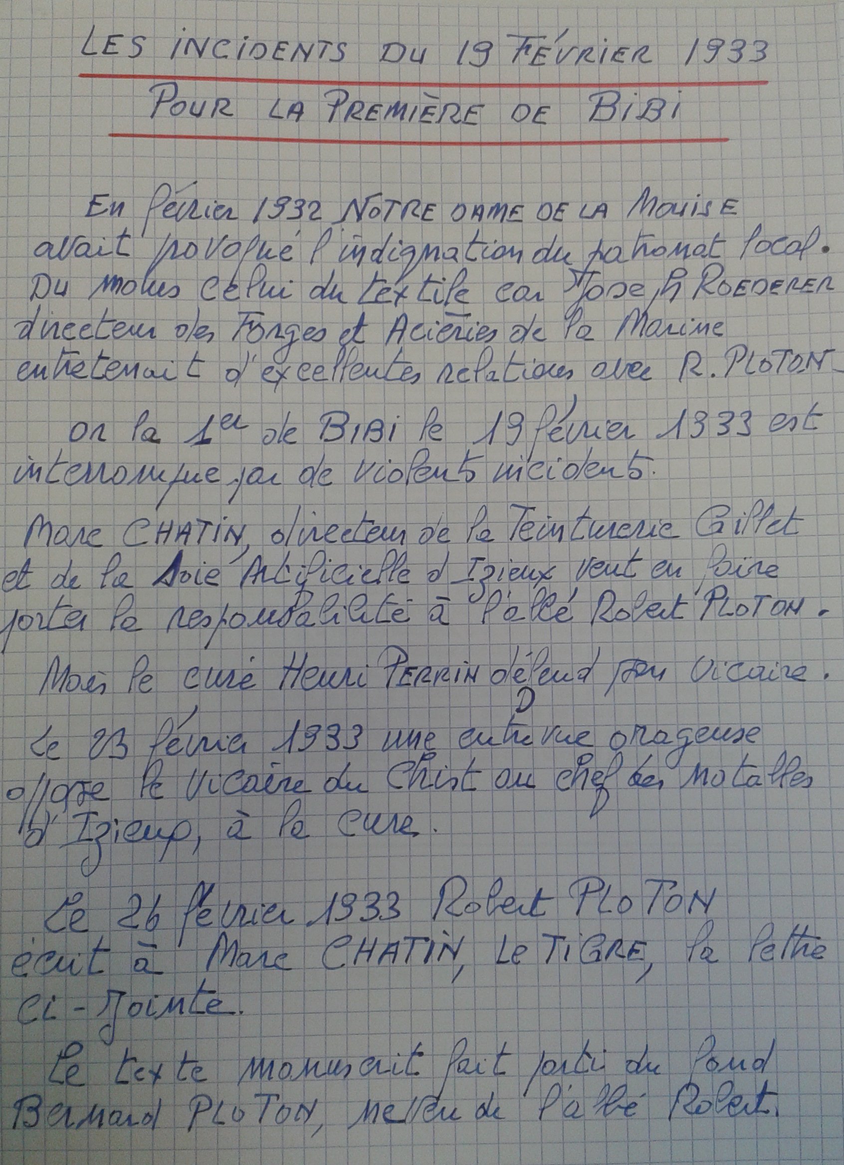Le mercredi 6 octobre 1943, Maurice BONNEVIALLE est attendu au presbytère de la Nativité où il doit rapporter des sceaux à Robert PLOTON. Il arrive en vélo par la rue des Alliés et Fourneyron. Rue Royet, alors qu'il approche de l'église, son attention est attirée par des groupes qui chuchotent et paraissent très animés. Maurice met pied à terre et s'approche. Des femmes pleurent. Il les interroge. Elles lui disent que leur curé a été arrêté peu après 9 heures et qu'il a été blessé alors qu'il tentait de fuir en 'traboulant' vers la rue du Treuil (maintenant rue Roger Salengro) par le jardin du 93 de la rue Royet.
