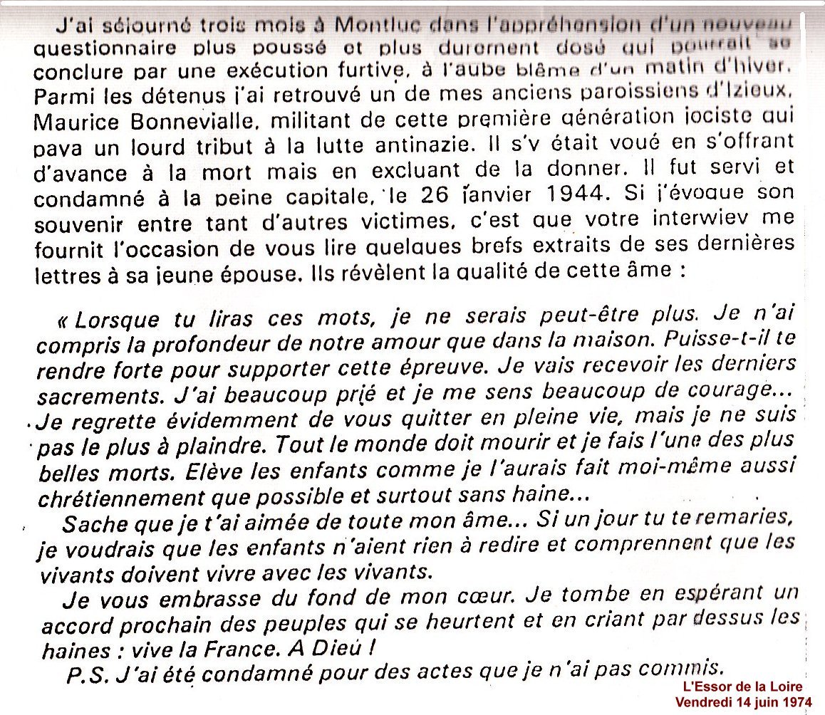 Dans la dernière de ces lettres en date du 5 février, Maurice écrivait : 'Ayez du courage. Lorsque vous lirez ces mots, je ne serai plus qu'un souvenir. Je vous écris de ma cellule de condamné à mort où je suis enfermé depuis le 26 janvier, jour de mon jugement. Je regrette évidemment de vous quitter en pleine vie, mais je voudrais que mes gosses vivent aussi honnêtement que leur père qui les aimait bien... Je ne suis pas le plus à plaindre. Tout le monde est pour mourir ici-bas, et je fais l'une des plus belles morts. Je vous aime et je vous embrasse. Vive la France.' " (...)