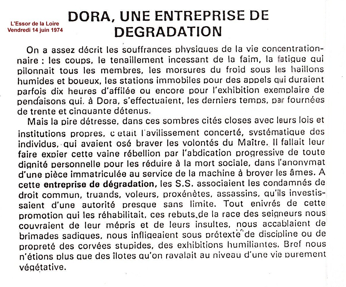 Ce sera un long calvaire qui conduira Robert PLOTON de la prison Montluc de Lyon, en passant par Compiègne à Buchenwald, jusqu'à Dora, qui est une usine souterraine des nouvelles armes V1 et V2, et où les conditions de travail et de vie sont particulièrement atroces. "De Montluc à Dora, l'Usine des Armes Secrètes" par Robert Ploton, Matricule 44015. Ce texte fut publié parle journal "La Dépêche" en 14 épisodes au mois d'août 1945, et sortit également en brochure.