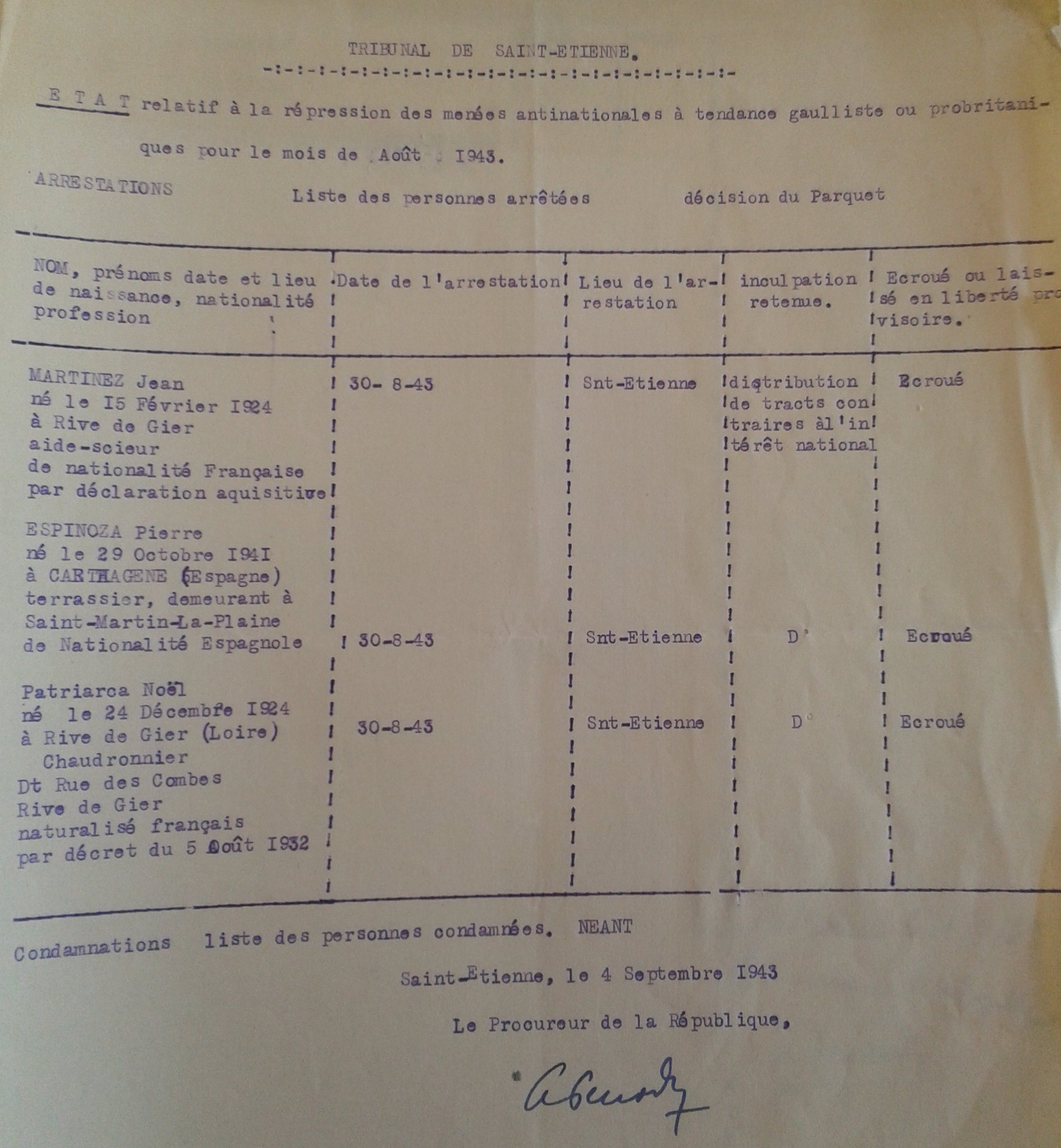 Salvator PARRA a t-il été prévenu ? Car malgré toutes les dispositions prises ici et ailleurs, ce familier de Robert PLOTON et d'Izieux va tomber. C'est le 13 octobre 1943 qu'il est appréhendé par l'Abwehr, ainsi que sa femme enceinte. Le 14, les parents de celle-ci, Jeanne et Paul LAGNIE [agent de liaison, il travaillait à la MAS - Manufacture d'Armes de Saint- Étienne], sont interpellés chez eux, rue Pétrus Maussier à Saint- Étienne. Ils ne rentreront pas de déportation. Leur fille, internée à l'hôpital de l'Antiquaille, sera délivrée par un groupe de Lyon. Salvator PARRA reviendra très affaibli de Mauthausen.