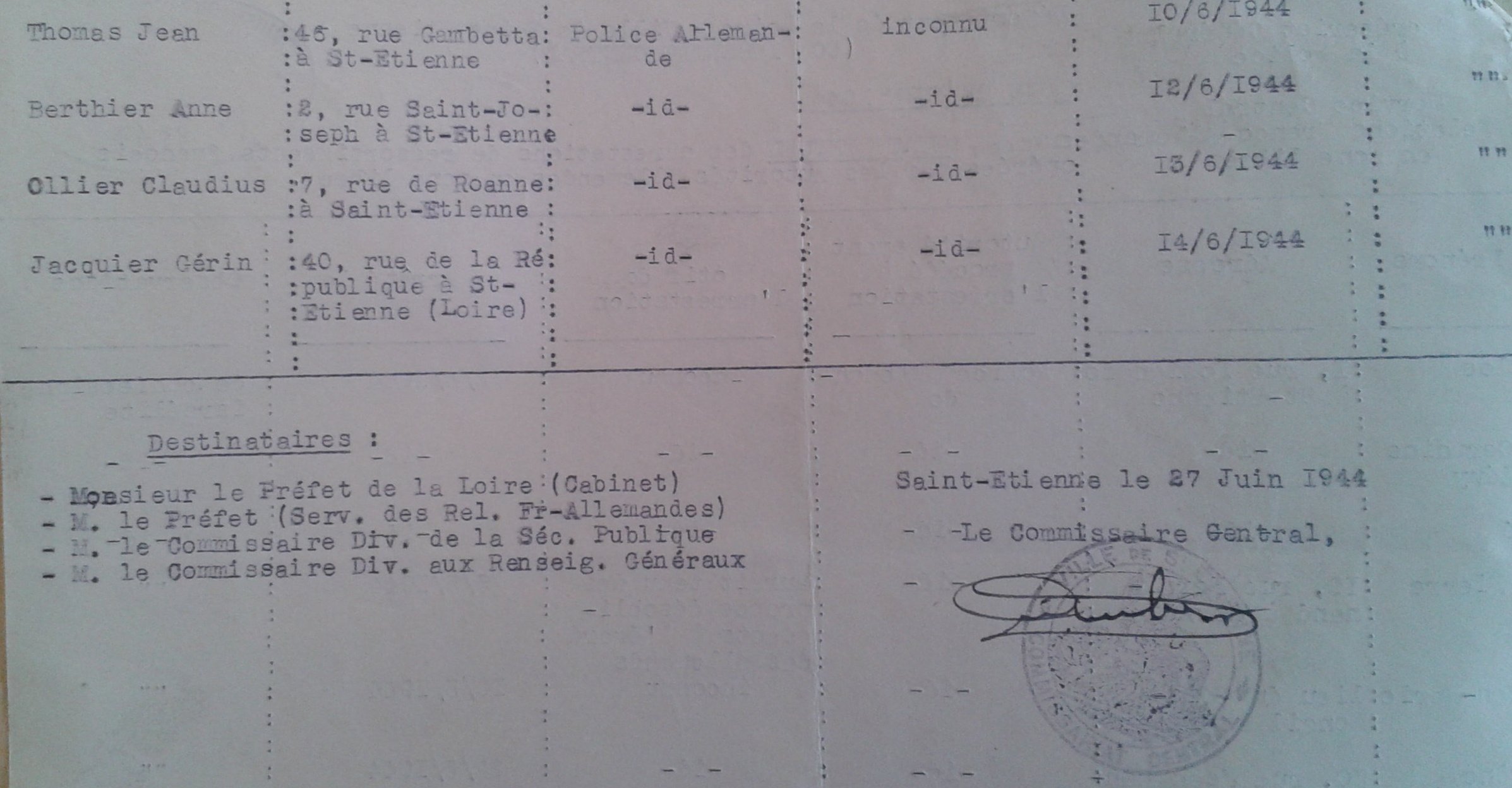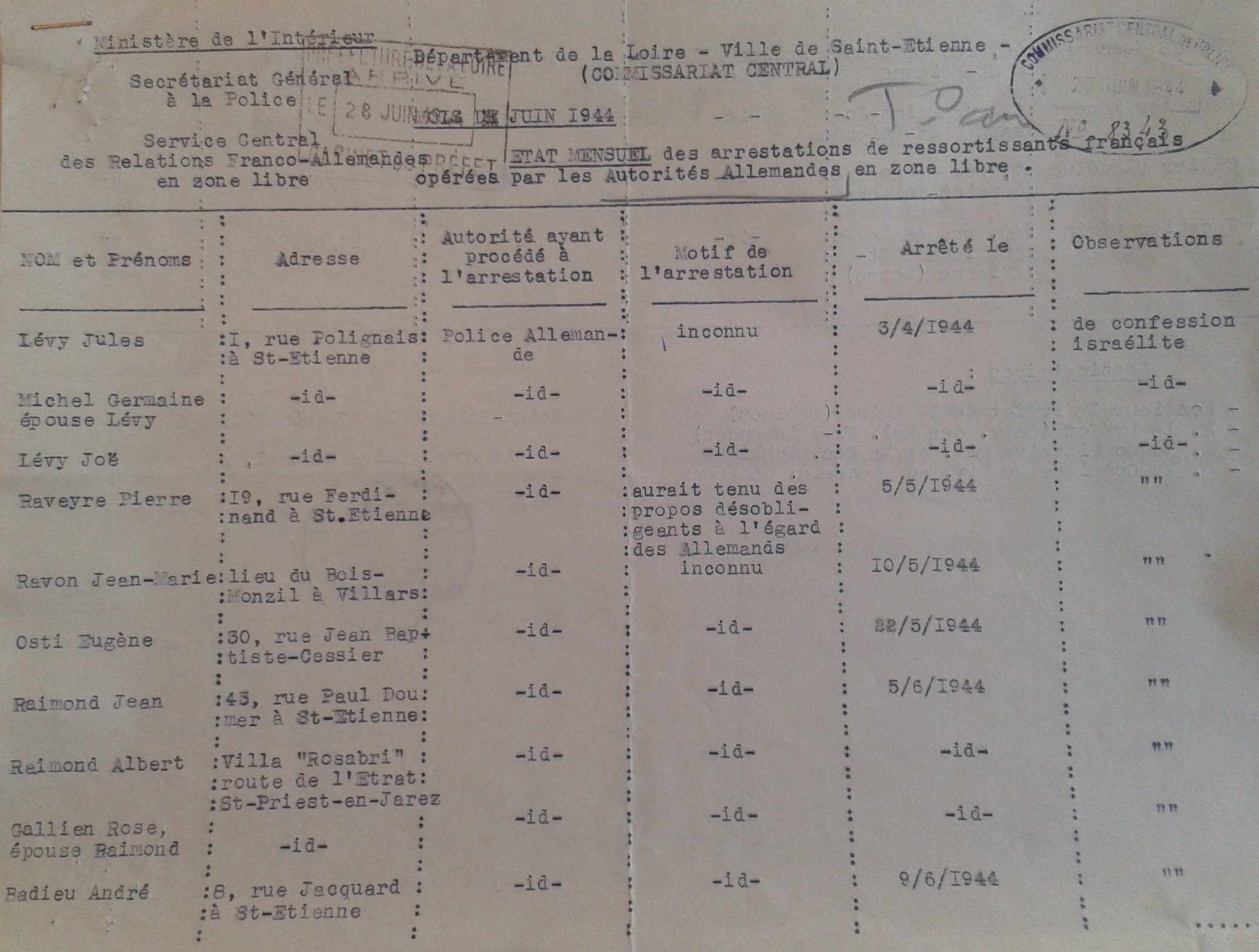 En entrant il reconnaît, arrêtés aussi du matin, Dora RIVIÈRE (médecin protestante avec laquelle il a travaillé pour mettre sur pied un service social clandestin au service des enfants de proscrits), Bernard MULLER, la famille CHAUVENG, le sénateur Jean TAURINES, ainsi que Charles Pierre LUTZ, réfugié alsacien engagé de force dans la Wehrmacht (adjoint de Jean-Baptiste CERRUTTI, chef du groupe Franc du mouvement Libération sur la région stéphanoise) qu'il avait hébergé après sa désertion et qui mourra à Ellrich.