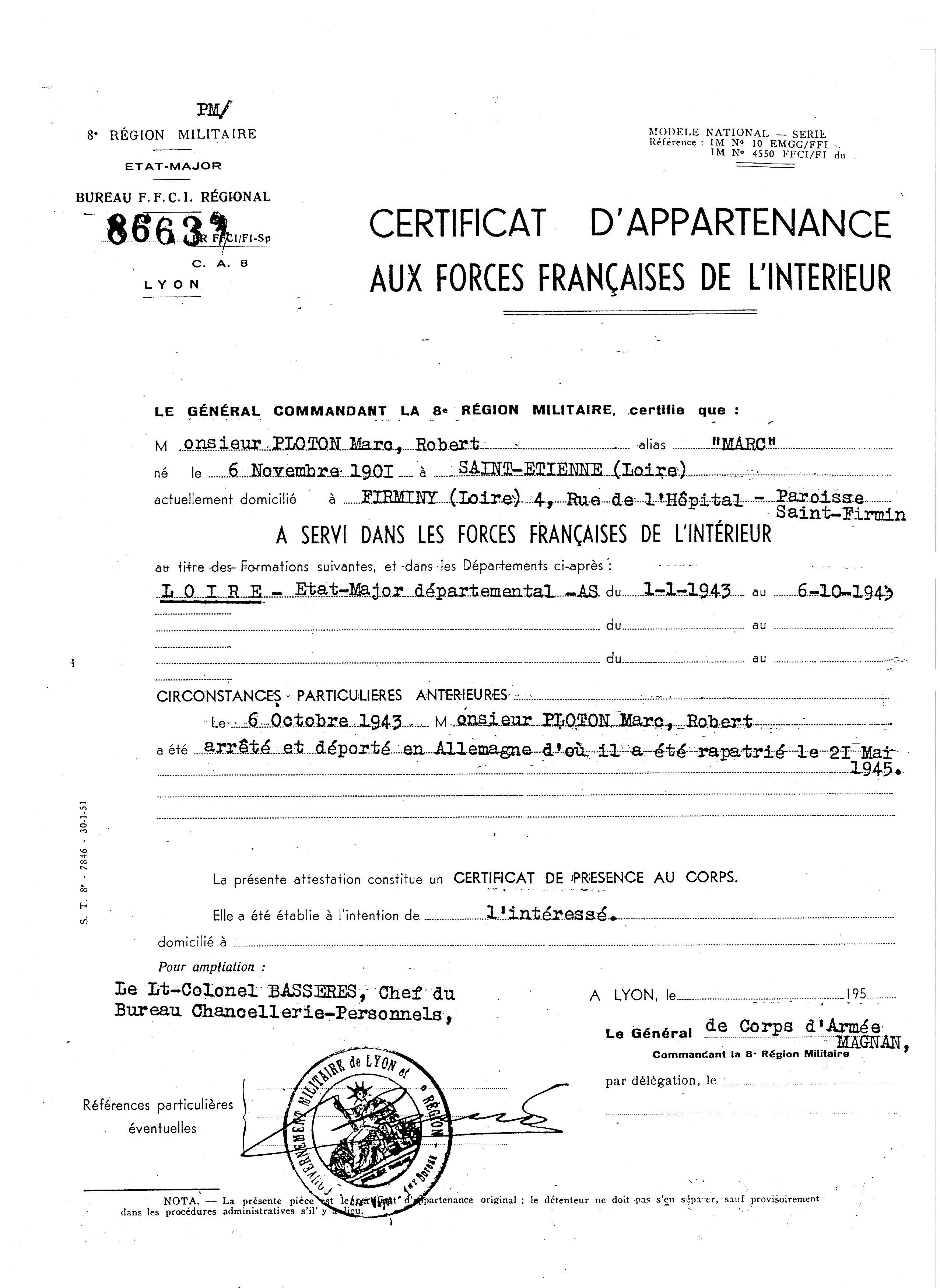 Depuis l'armistice, Robert PLOTON est désormais résistant, jusqu'à son arrestation le 6 octobre 1943.