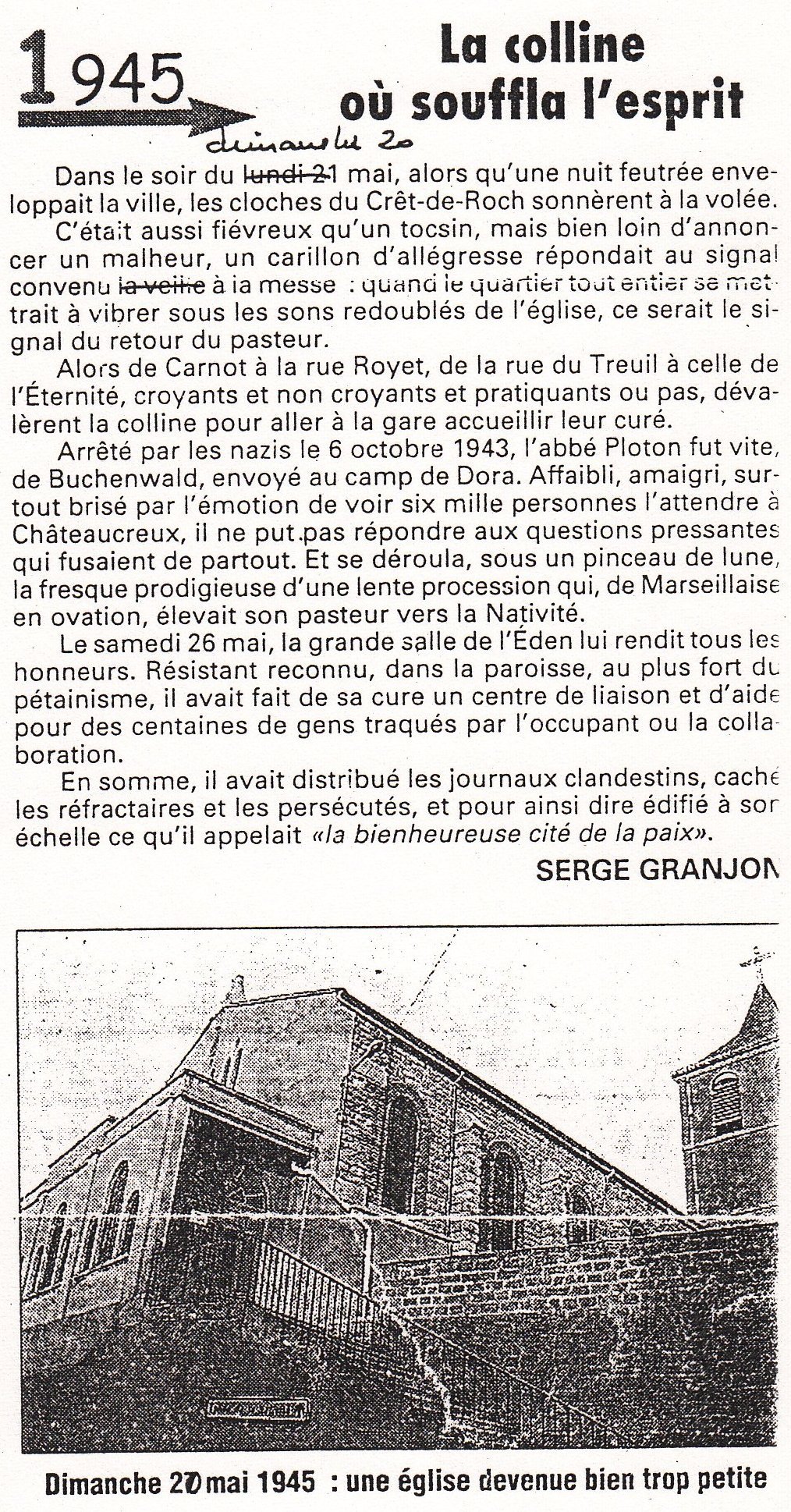 "Et ce 21 mai 1945, alors que le crépuscule tombe doucement sur la ville, tout le Crêt de Roch républicain, le Crêt de Roch communiste, et le Crêt de Roch chrétien, (...) vivent un moment rare mais intense de pure émotion et partagent un grand frisson de fraternité."