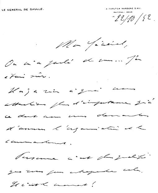LETTRE MANUSCRITE DE de GAULLE À DELESTRAINT