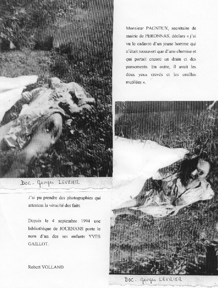 VÉRON-LACROIX me dit à son tour : "je suis aussi de Témoignage Chrétien". Puis c'est au tour de VIAL : "je suis communiste, en tendant ma poitrine à mes assassins, je crierai 'Vive la liberté, vive la France !' ". Voici la dernière image que je conserve de ces trois martyrs, qui furent massacrés, et leurs corps brûlés avec 117 autres à Saint-Genis-Laval.